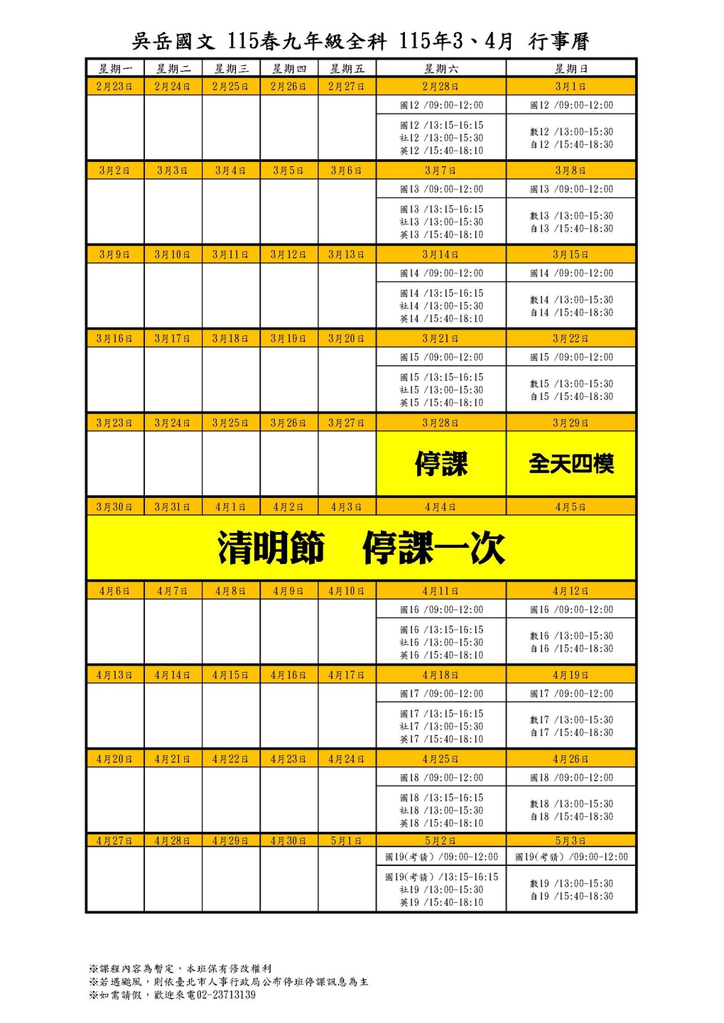 開啟上方區塊 內容管理:115年3、4月-國九班 行事曆-吳岳國文補習班-國文補習班 選擇後頁面內容會更新 選擇觀看內容 吳岳公告吳岳資訊網站FAQ網站連結 吳岳公告 / 內容類型:新聞類型 吳岳公告首頁 國中行事曆 吳岳總部 瀏覽:121 搜尋 選擇吳岳公告分類 近期講座考試新訊熱門課程網站公告吳岳行事曆 選擇吳岳公告項目 吳岳總部 選擇內容年度 115年 (2026)114年 (2025) 送出 115年3、4月-國九班 行事曆 行事曆學習資訊 發佈者:wuyue01 / 發佈時間:2026-02-03 / 內容狀態:啟用中 ::: 國小行事曆 國中行事曆 高中行事曆 內容標籤 資訊 36教學 5報名 14活動 3行事曆 22講座 10公告 4注意 7課程 13測驗 7特色 1節日 1重要 20學習 34 頁面QRcode 115年3、4月-國九班 行事曆 115年3、4月-國八班 行事曆 115年3、4月-國七班 行事曆 115年1、2月-國九班 行事曆 115年1、2月-國八班 行事曆 115年1、2月-國七班 行事曆 觀看更多內容 ::: 115年3、4月-國九班 行事曆 115年3、4月-國九班行事曆,檔案如附件請自行點閱或下載。 前往課程報名頁面 內文可瀏覽群組: 註冊會員 訪客 內容附件下載 Download attachment 線上瀏覽檔案 各班115年0304月行事曆國九 檔案下載 吳岳公告-相關內容 related information 114年11、12月-國九班 行事曆 115年3、4月-國八班 行事曆 114年11、12月-國七班 行事曆 114年11、12月-國八班 行事曆 115年1、2月-國七班 行事曆 115年3、4月-國七班 行事曆 115年1、2月-國八班 行事曆 115年3、4月-國九班 行事曆 115年1、2月-國九班 行事曆 ←前往上一頁